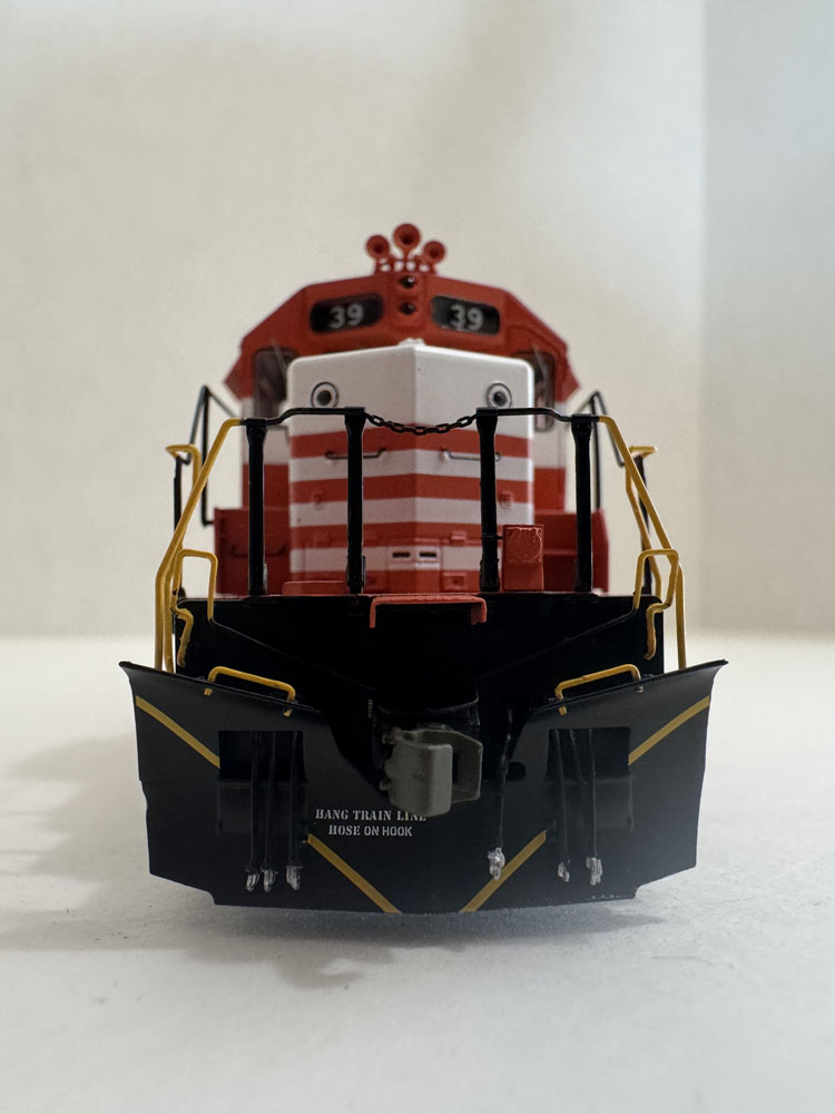 Front view of the model. The lettering next to the coupler wore off by the early 1980s and was not re-applied. The yellow stripes applied to the plow also wore off by the early to middle 1980s, at which time the