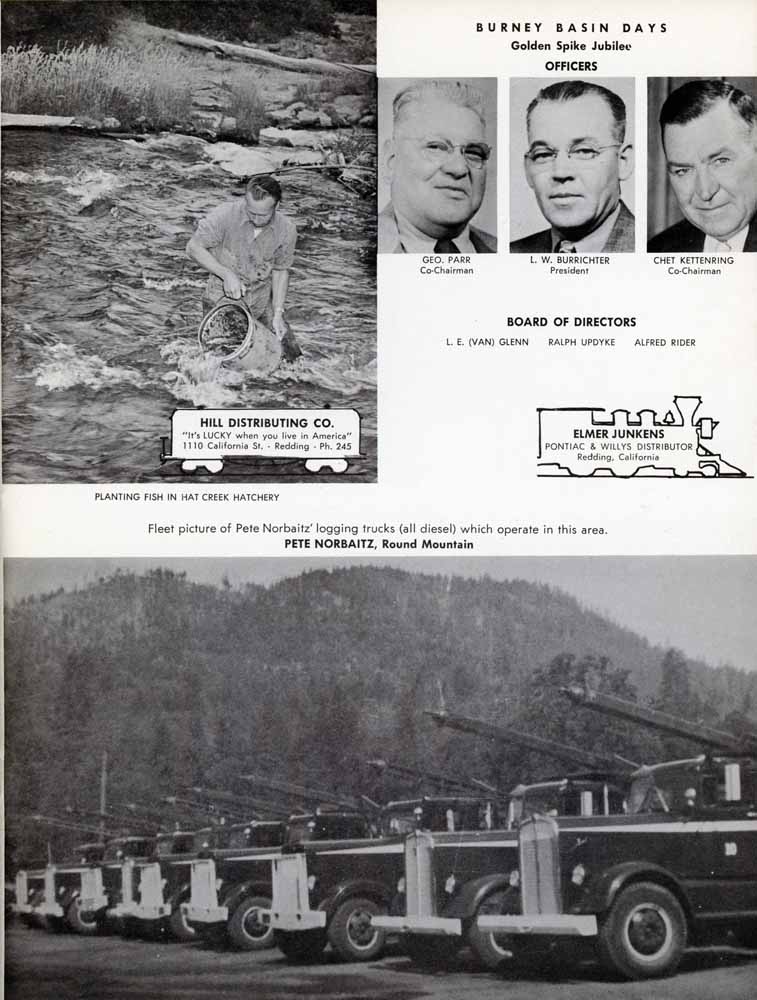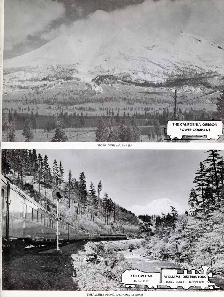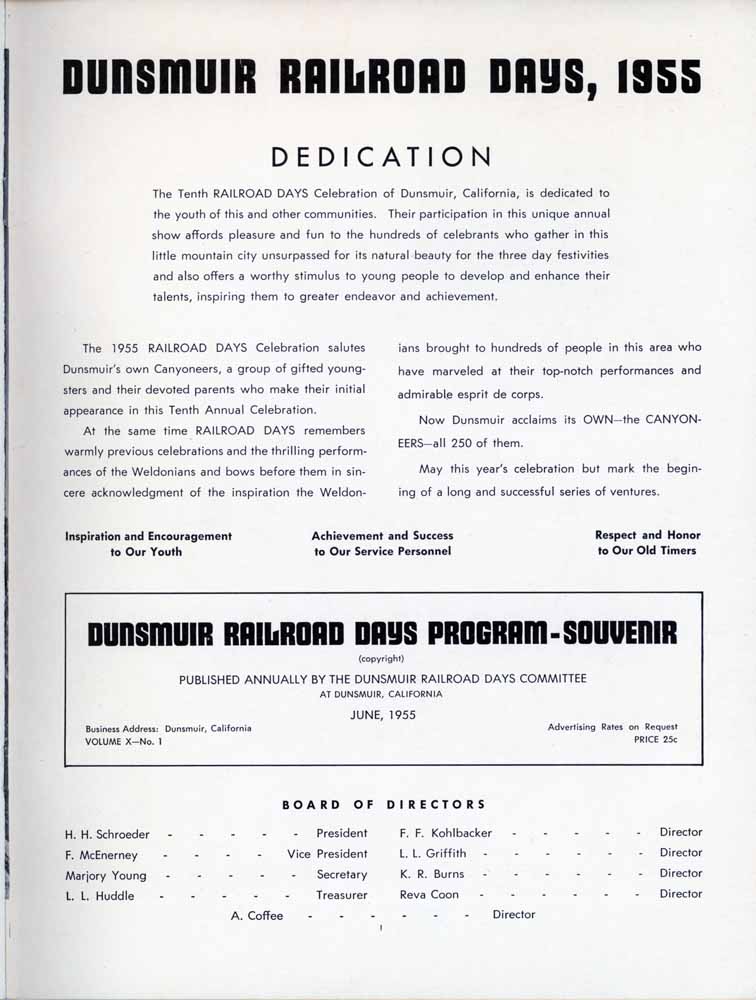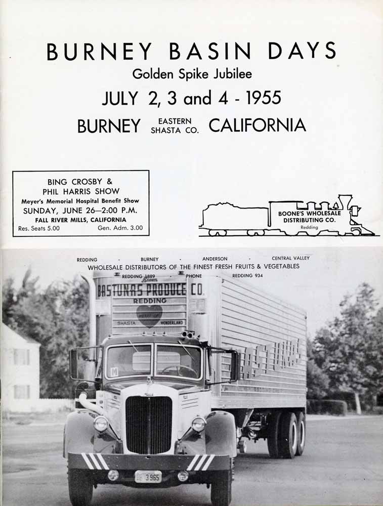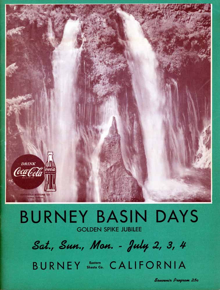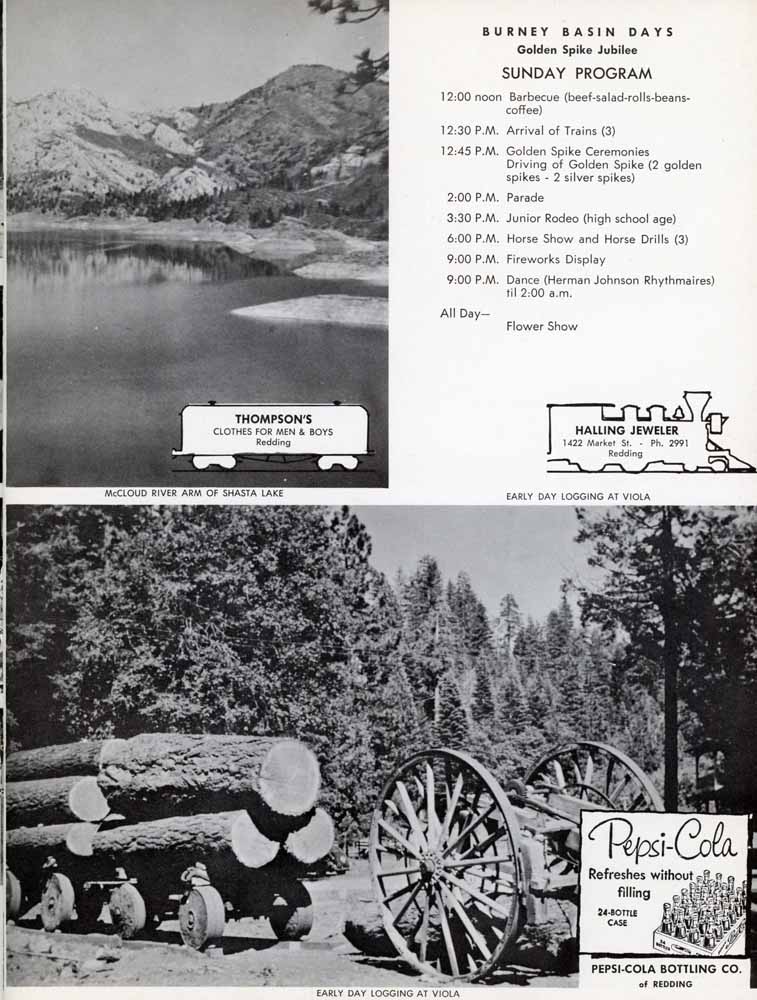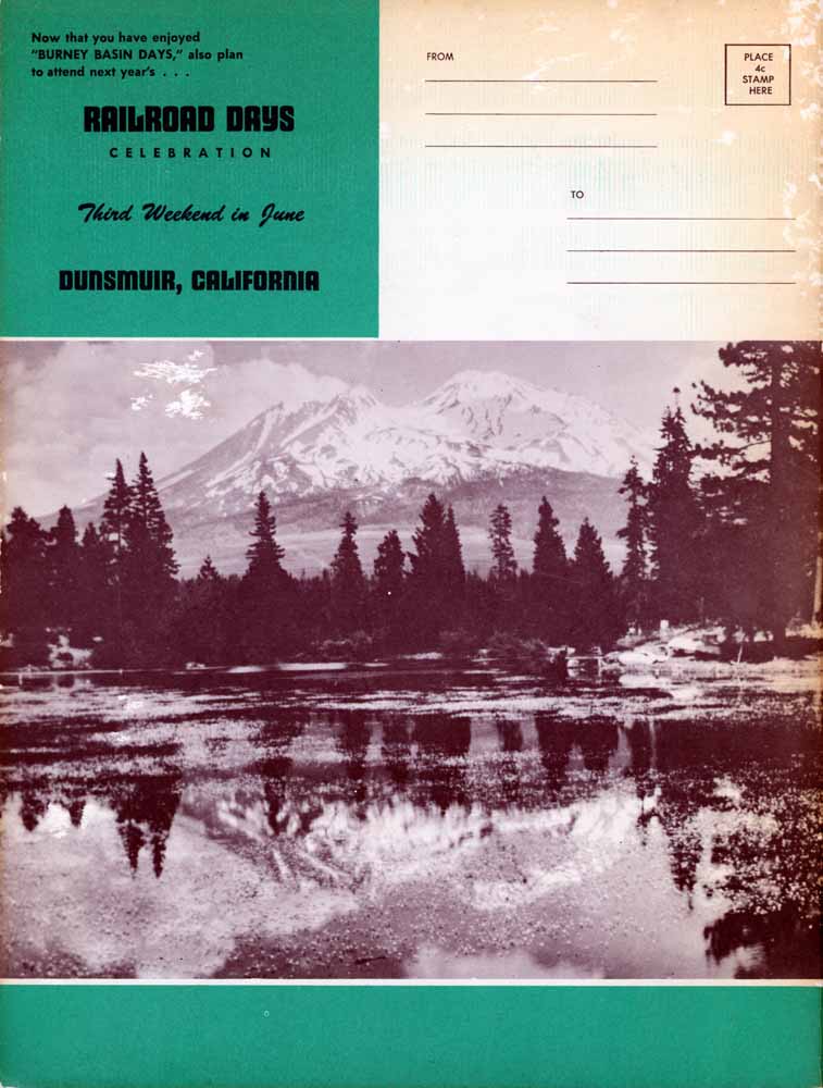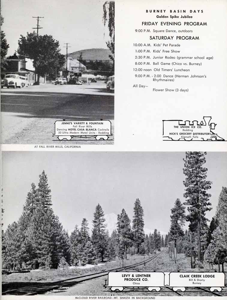In 1946 Dunsmuir held the first of what has become its annual Railroad Days community celebration and event. The tenth such event scheduled for the weekend of 16-18 June 1955 fell two weeks before celebrations marking the completion of the McCloud River Railroad's new Burney extension, and in honor of that event the town of Burney renamed its annual Burney Basin Days held around the July 4th holiday to the "Golden Spike Jubilee". The organizers of the two events combined their efforts to produce a souvenir program covering both events. The program is reproduced here in its entirety, in the order the pages appear in the original. Some of the pages have been rotated to a Landscape format for viewing ease. One note, the first half of the program covers the Burney Basin Days/Golden Spike Jubilee, while the Dunsmuir Railroad Days are in the back half, but the Dunsmuir events start sequentially at the rear cover and work forward from there, as a result the program in its raw form appears in reverse order of the actual events below. |