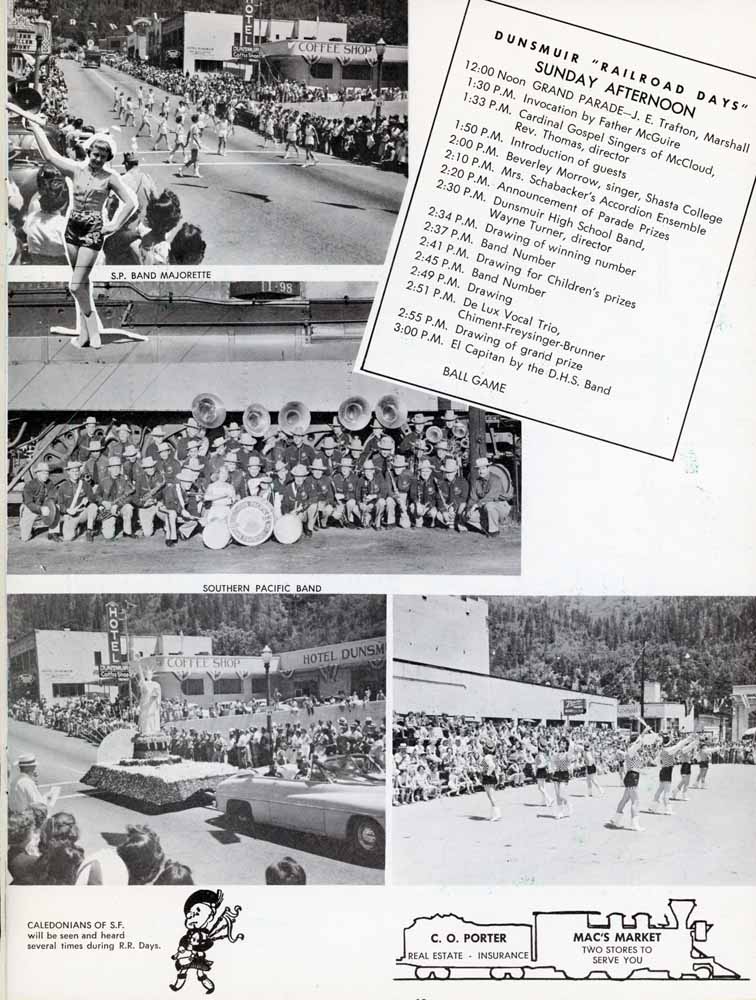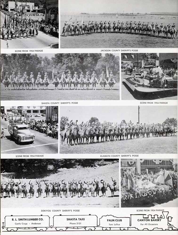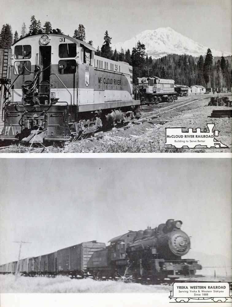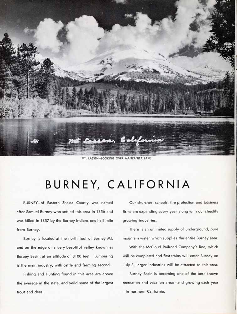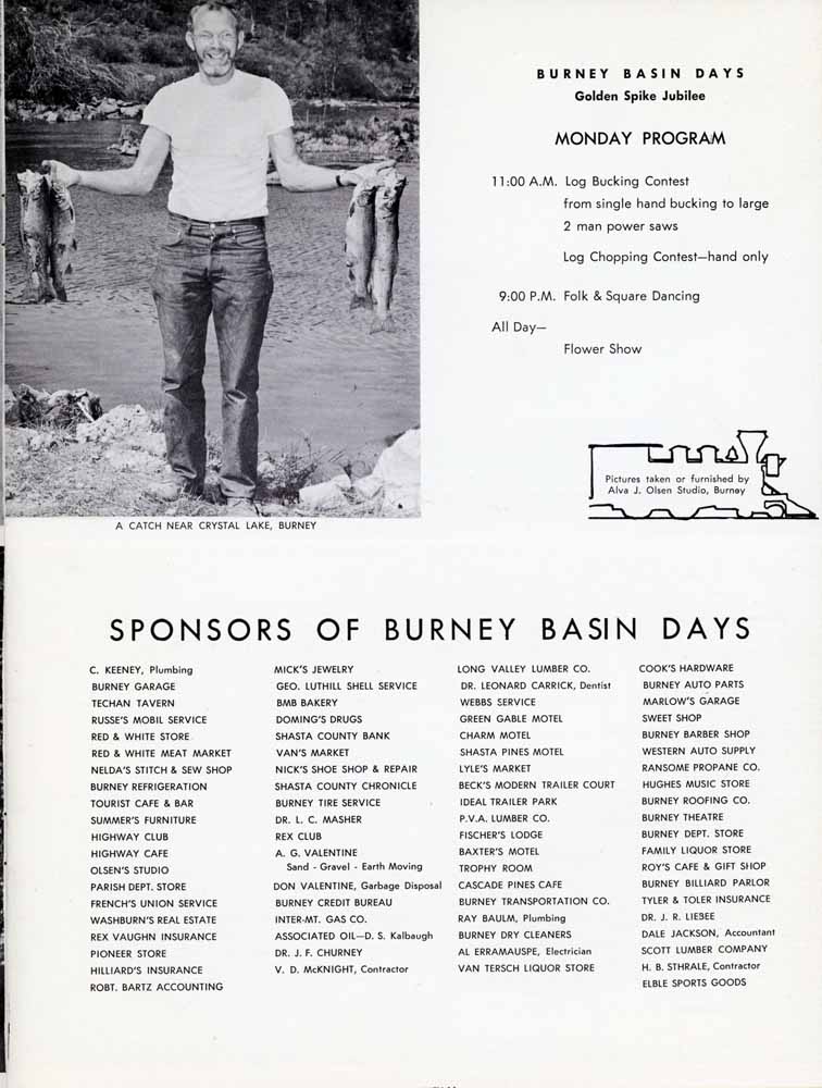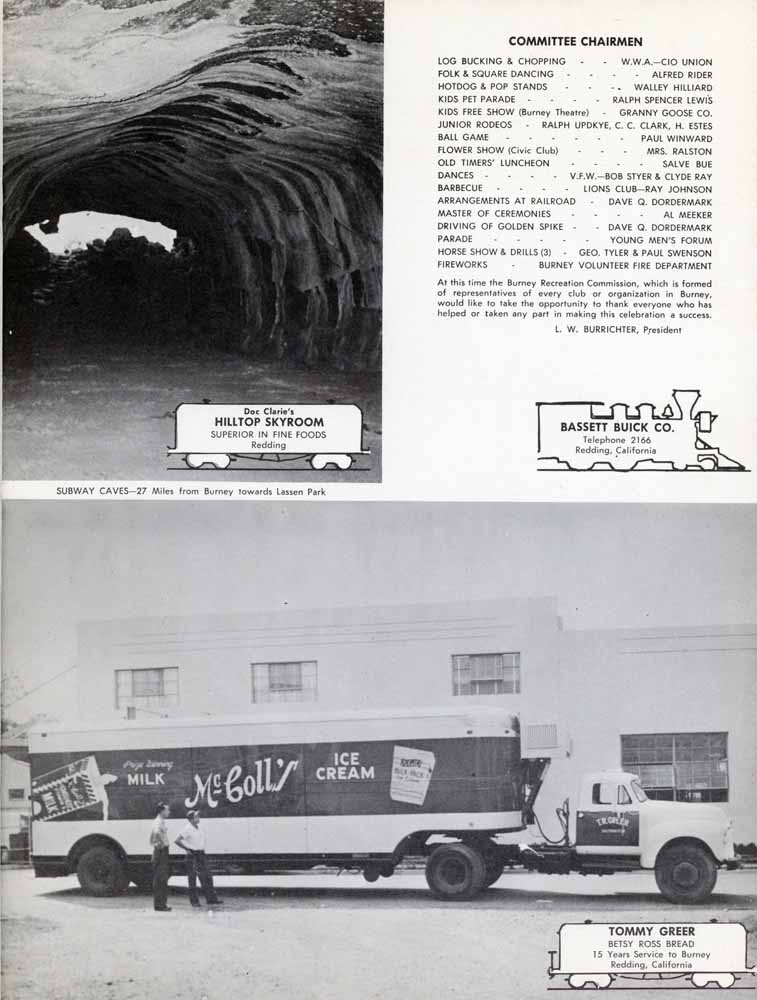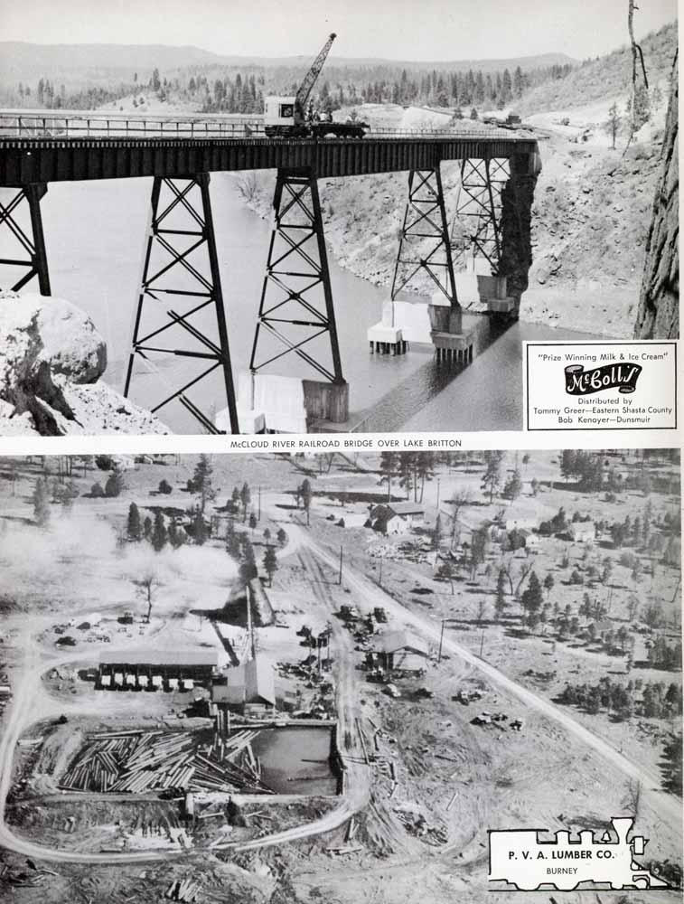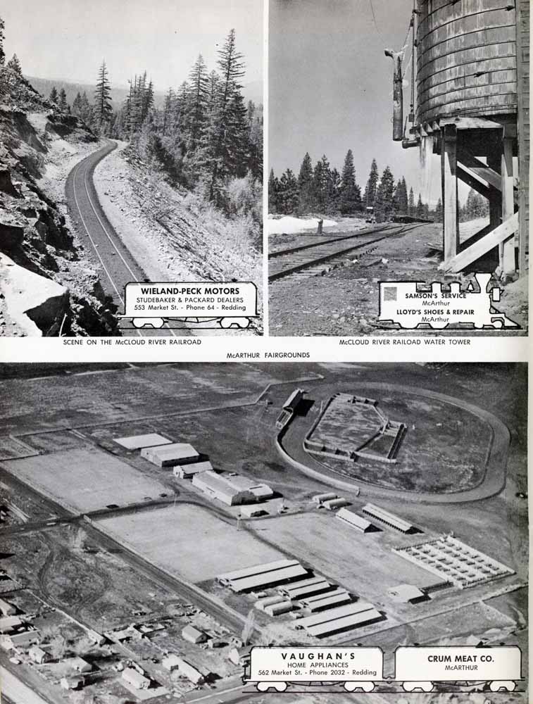 In 1946 Dunsmuir held the first of what has become its annual Railroad Days community celebration and event. The tenth such event scheduled for the weekend of 16-18 June 1955 fell two weeks before celebrations marking the completion of the McCloud River Railroad's new Burney extension, and in honor of that event the town of Burney renamed its annual Burney Basin Days held around the July 4th holiday to the "Golden Spike Jubilee". The organizers of the two events combined their efforts to produce a souvenir program covering both events. The program is reproduced here in its entirety, in the order the pages appear in the original. Some of the pages have been rotated to a Landscape format for viewing ease. One note, the first half of the program covers the Burney Basin Days/Golden Spike Jubilee, while the Dunsmuir Railroad Days are in the back half, but the Dunsmuir events start sequentially at the rear cover and work forward from there, as a result the program in its raw form appears in reverse order of the actual events below. |