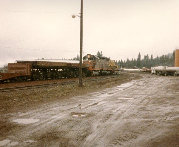 One of the SD38's with a work train consisting of m-o-w flat #1000, side dump hoppers #1852 and #1860, and another flat carrying the #966 loader. This train appears to have been taken early in the recovery effort. |