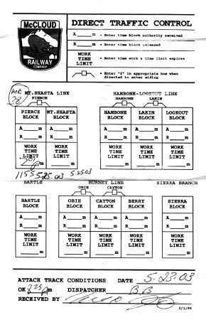 Other stipulations in the rule book spell out maximum allowable speeds within the DTC block that is held by two or more parties where no understanding between the parties is possible or can be reached. Blocks are released by those who have authority to hold them either by radio or by submission of a completed DTC block form to the dispatcher at the end of the tour of duty. In the scenario described above, if the maintenance of way crew finishes their work in the Cayton block and releases it back to the dispatcher before the train returns to McCloud, then the dispatcher will cancel the train crew’s previous joint work and time authority to be in the Cayton block, replacing it with an authority to occupy the block “all alone”.