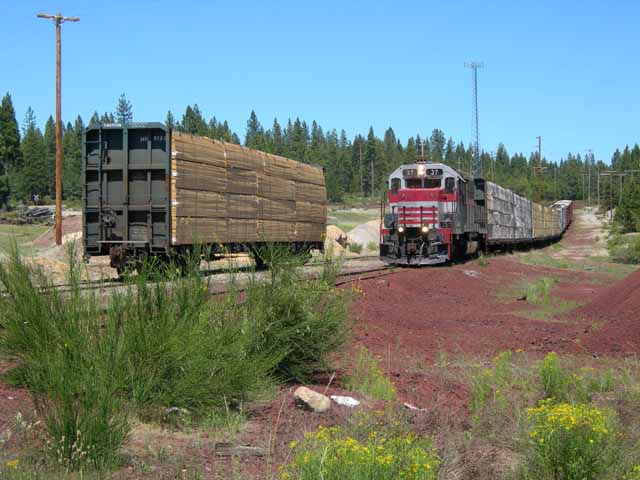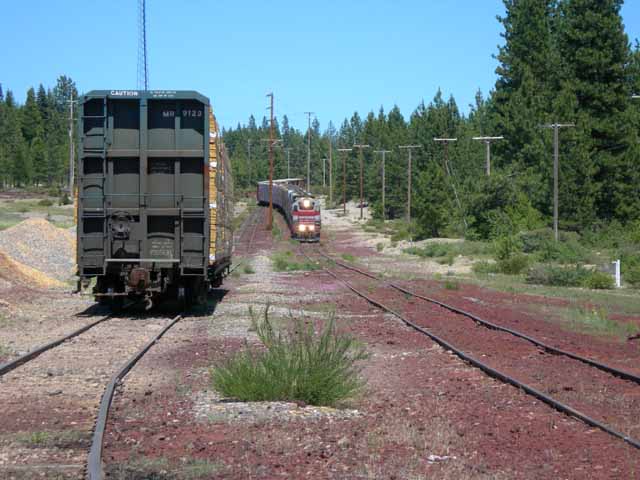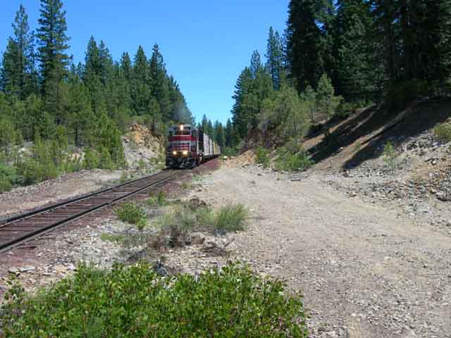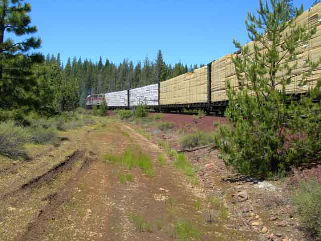 Rolling on the last few miles into McCloud. The train is approaching the Dry Creek Spur, which today is barely a carlength long. At one time the railroad had a small yard at this point, and the last railroad operations of the McCloud River Lumber Company went south from this spot to points deep in the mountains on the south side of the McCloud River. |