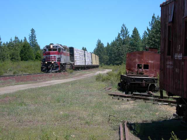 Rolling into the eastern edge of McCloud the train passes part of the Great Western Railway Museum collection. The crane body and frame on the right side of the photo are a Brownhoist crane originally owned and operated by the McCloud River Lumber Company. At some point the crane got converted from steam to diesel power, and it stayed with the railroad after the lumber company got out of the railroad logging business. The McCloud River Railroad assigned the #72 to this crane and used it up until 1986, when titled passed to the museum as part of a lawsuit settlement. Former McCloud River Burro crane #1851 and flat #501 are also stored here but just out of the picture; at last report these cars are for sale. |