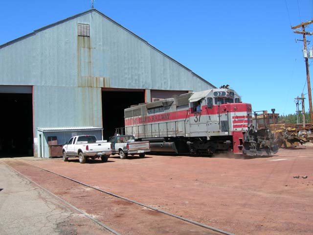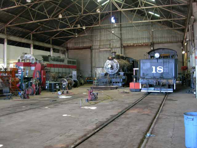 A peak inside the shop building yields this view of steam locomotives #18 and #25 and diesel #36. The #18 is still awaiting shipment to Nevada, which now appears may not happen until sometime in 2007; the #25 is still owned by the McCloud Railway, but its future is an open question; and the #36 is currently considered out of service but could be used if needed. |