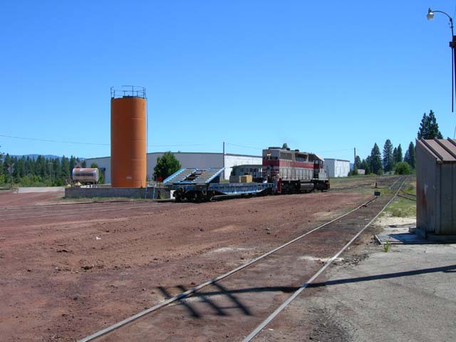Once the load pulled from the shop has been added to the train brought from Burney the crew prepares to shove the #821 flat into the shop. Caltrans is in the middle of a major reworking of Highway 89 that will consume the next 4-5 years and involve major improvements over the entire stretch between McCloud and the junction with Highway 299 just east of Burney, and part of those improvements involve widening the roadway from two to four lands at the Lorenz crossing. A contractor will be delivering a new crossing guard setup tonight, which will be loaded onto the flat for transport to the job site. |