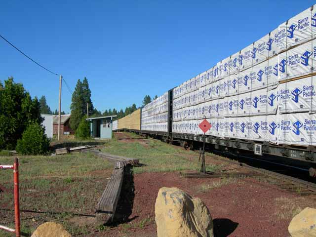 By early Monday morning the grade crossing pieces had been loaded onto the #821 flat. The train departed for Burney in the early morning, with six of the seven centerbeams brought from Mount Shasta the previous Friday and the #821 flat bringing up the rear. The train operated straight through to Burney, where the crew left the #821 flat at Berry before going down the branch to the mill. |
