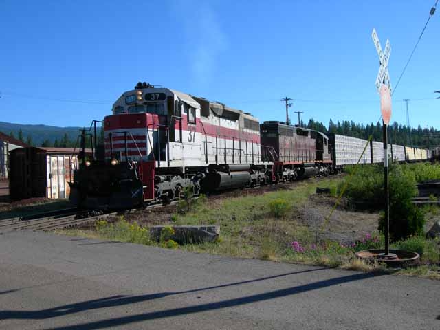 The #37 and #38 pause briefly before shoving their train on out to the mainline east of the yard, where the ten boxcars and the caboose wait. Those cars will be added to the train which will then head for Mount Shasta City and the Union Pacific interchange yard. |