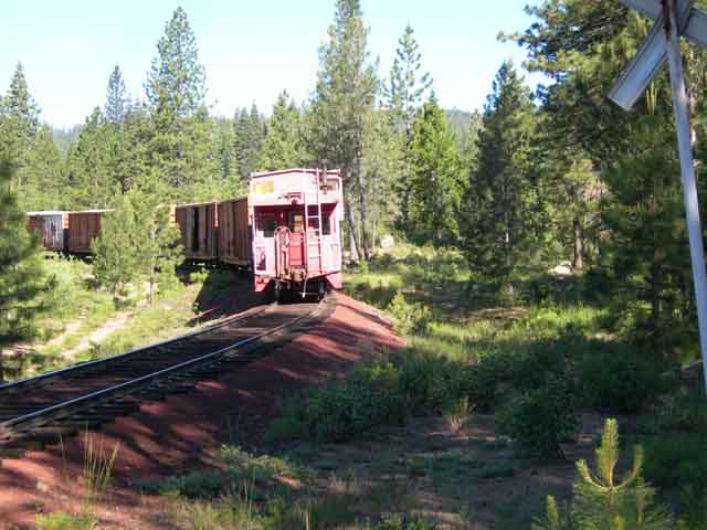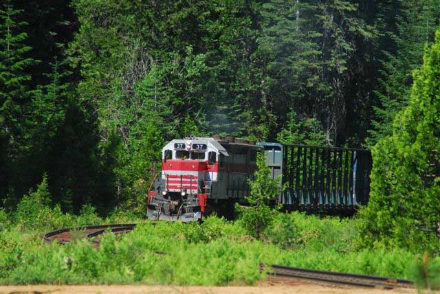 A few miles uphill out of the McCloud caboose #101 follows the thundering locomotives as they try hard to move the train up the hill. I had to leave the train at this point, and I had another engagement to attend to. The crew made it to Mount Shasta City successfully, where the loads were set out and a total of seven empty centerbeams were picked up and brought back to McCloud. |