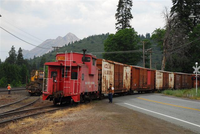 Thursday morning started with the #38 moving the rest of the boxcars brought from Pondosa on Tuesday up to the siding at Pierce, the summit between McCloud and Mount Shasta. The #38 then ran light engine straight through to Lorenz, where the locomotive coupled onto the #821 flat and called it a day. |