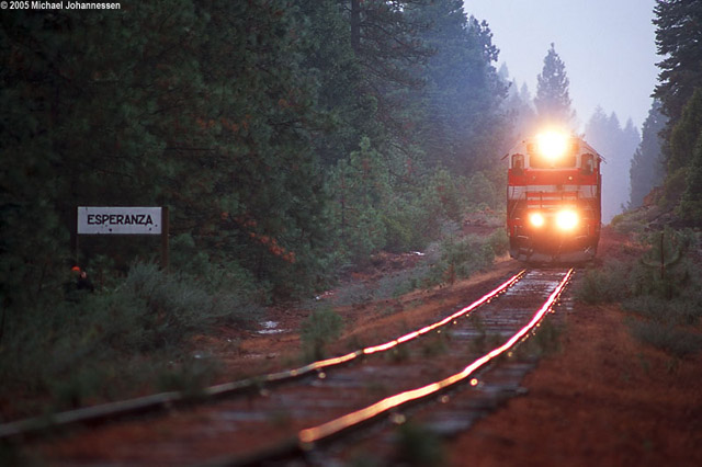 On 11 November 2005 the McCloud Railway ran another significant "last run", this time to Hambone. The last through freight to and from Lookout Junction ran through Hambone on 16 December 2003. The rails through this remote spot remained quiet until 28 November 2004, when a work extra ran out to the ballast pit at Porcupine to get a few last carloads of cinders. A speeder run made it to Hambone in the summer of 2005, and during October a salvage contractor hired by BNSF removed the line beyond the end of McCloud Railway ownership at Hambone, leaving the spot at the end of a long spur up from Bartle. Hambone first came into existence as a McCloud River Lumber Company log camp around 1920. The camp, originally known as Camp 2 and then as Pondosa, consisted of a sizeable community to house loggers and woods-based railroad crews. The lumber company also built a large repair shop. All of this activity ceased after 1927 when the lumber company moved the camp, and the name, south to the current site of Pondosa. This area then became known as Hambone, reportedly after a ham bone nailed to a tree. Activity returned to Hambone in 1928 as the lumber company extended a new line through the site, headed for the newly acquired White Horse tract far to the east. The McCloud River Railroad finally reached Hambone around 1929 when it acquired the trackage from Car A to this spot from the lumber company. At the same time the lumber company sold the line east of Hambone to the Great Northern Railroad. The two railroads chose Hambone as the junction spot, as it was about the only place in the area with enough flat ground to build the necessary interchange yards and servicing facilities. However, the Great Northern decided to hire the McCloud River Railroad to operate their portion of the line, and as a result the planned facilities were never constructed. The railroads did base a section gang at Hambone. Elkins Cedar Mill built a sawmill and a small community to support it at this site. The sawmill and the community functioned from roughly 1936 until 1943, when it was closed and the camp was raised. The railroads bypassed the original site of Hambone in 1956 with a major line relocation. The railroad built a 1,032 foot long passing siding and a section shed on the new alignment. Hambone continued to feel the rumbling passage of the nightly freights bound for Lookout Junction until 1978, when a series of sawmill closures brought traffic levels down. The next 25 years saw operations through Hambone vary from one train every two or three weeks up to 3-4 trains a week, depending on the ebb and flow of traffic patterns. Traffic handled to and from Lookout Junction declined to less than six cars a week after 1998. A haulage agreement ended all rail movements in December 2003. BNSF received permission to abandon the line east of Hambone in early 2004. The McCloud Railway Company received permission to abandon the line from Bartle to Hambone in October 2005. However, some work still had to be done, as the siding at Hambone still held a string of GE Capital-owned boxcars. The McCloud Railway finally decided to get the stored boxcars in November 2005. The railroad needed track materials, and such parts could be removed from the line out to Hambone. However, the boxcars had to be removed first, and on Friday 11 November 2005 a crew made one final trip to Hambone with locomotives #37 and #38 to retrieve those cars. The train moved the cars from Hambone down to a natural sag a little above Car A, where they were left. The McCloud Railway Company received permission to abandon the line between Bartle and Car A in October 2005, but that decision is current stayed pending resolution of some potential Offers for Financial Assistance. There is at least a chance that the mainline to Burney may be saved, but the last remnant of the Lookout Line will serve no real purpose to any future operator. At least one more trip will need to be made up from Bartle to get these cars before the last part of this line can be salvaged. A few railfans knew of the move in advance and were able to tag along. Michael Johannessen was among them, and he captured a number of images of this last train to Hambone. His photographs are presented on this page with his permission. Hambone saw railroading activity for the better part of eight decades. Silence has returned to the forests. |