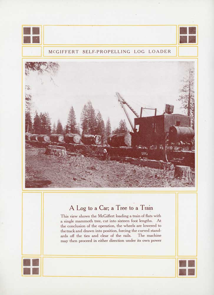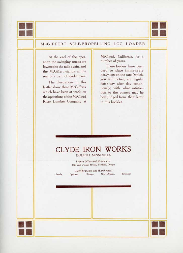 The Clyde Iron Works of Duluth, Minnesota, became an early developer and manufacturer of steam powered logging equipment as the industry matured in the vast white pine forests of the Upper Midwest. John R. McGiffert joined the firm as its vice president and general manager in 1901, and he led the development of a large number of the company's products through his 45-year career. The machine for which he is best known and remembered is the "McGiffert Self Propelling Log Loader", which he invented around the time Clyde hired him. Clyde between roughly 1902 and 1930 built nearly a thousand McGiffert loaders that saw service in all corners of the United States, but especially in the pine regions of the Upper Midwest, the south, and the Intermountain West. The McCloud River operations purchased its first two McGiffert Loaders in 1907, and almost immediately followed that order up with a third. Shortly afterwards Clyde produced an advertisimg booklet for the McGiffert loader that was largely based around McCloud River's machines. This booklet is presented here in almost its entirety, omitting only a couple pages that otherwise did not have any printing on them. More information on McCloud's McGiffert loaders can be found on the following two pages of the site: McGiffert Loaders Roster Loading Logs at the Landing |