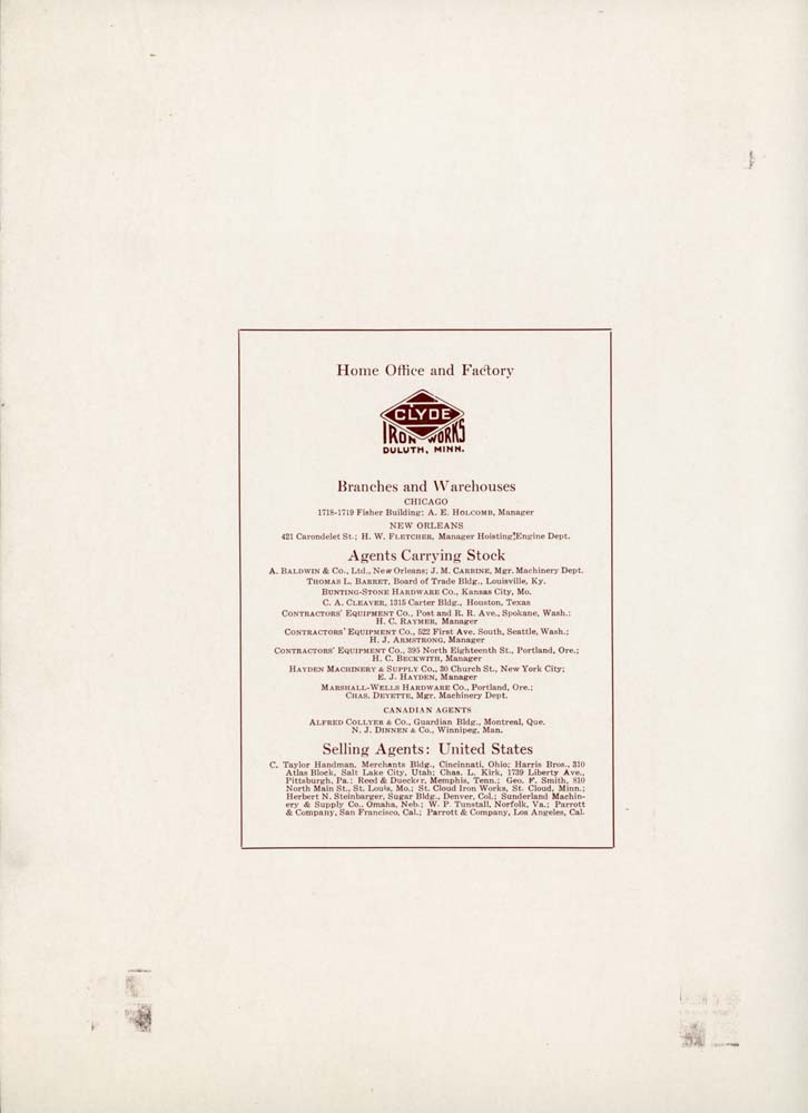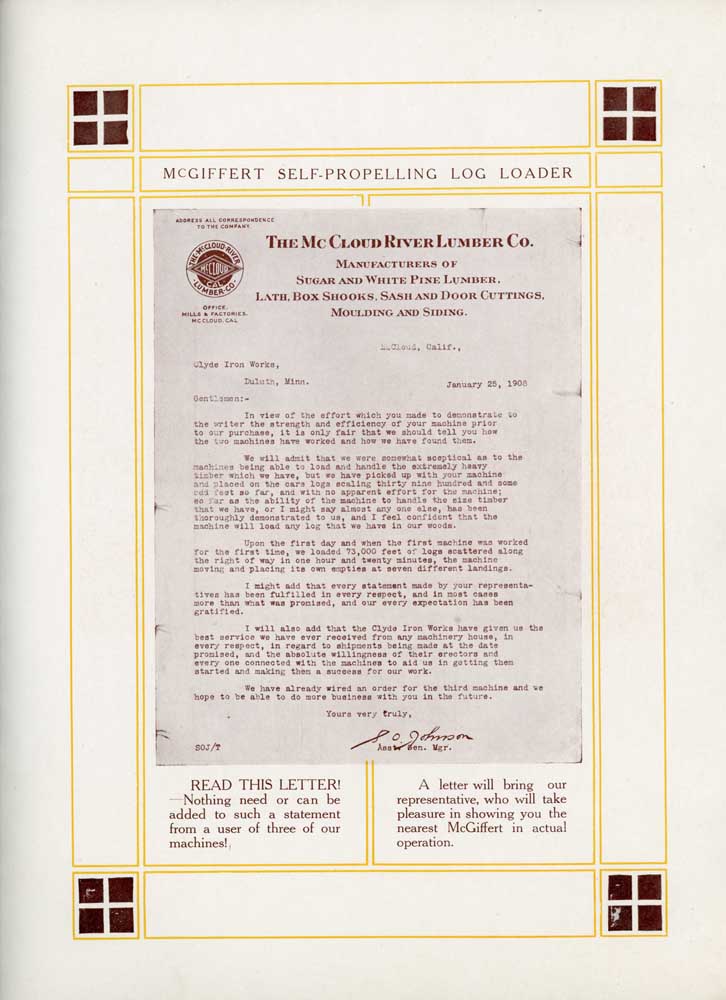 by S.O. Johnson, Assistant General Manager. The letter is as follows: "Clyde Iron Works Duluth, Minn. Gentlemen:- In view of the effort which you made to demonstrated to the write the strength and efficiency of your machinery prior to our purchase, it is only fair that we should tell you how the two machines have worked and how we have found him. We will admit that we were somewhat sceptical as to the machines being able to load and handle the extremely heavy timber which we have, but we have picked up with your maching and placed on the cars logs scaling thirty nine hundred and some odd feet so far, and with no apparent effort for the machine; so far as the ability of the machine to handle the size timber that we have, or I might say almost any one else, has been thoroughly demonstrated to us, and I feel confident that the machine will load any log that we have in our woods. Upon the first day and when the first machine was worked for the first time, we loaded 73,000 feet of logs scattered along the right of way in one hour and twenty minutes, the machine moving and placing its own empties at seven different landings. I might add that every statement made by your representatives has been fulfilled in every respect, and in most cases more than what was promised, and our every expectation has been gratified. I will also add that the Clyde Iron Works have given us the best service we have ever received from any machinery house, in every respect, in regard to shipments being made at the date promised, and the absolute willingness of their erectors and every one connected with the machines to aid us in getting them started and making them a success for our work. We have already wired an order for the third machine and we hope to be able to do more business with you in the future." |