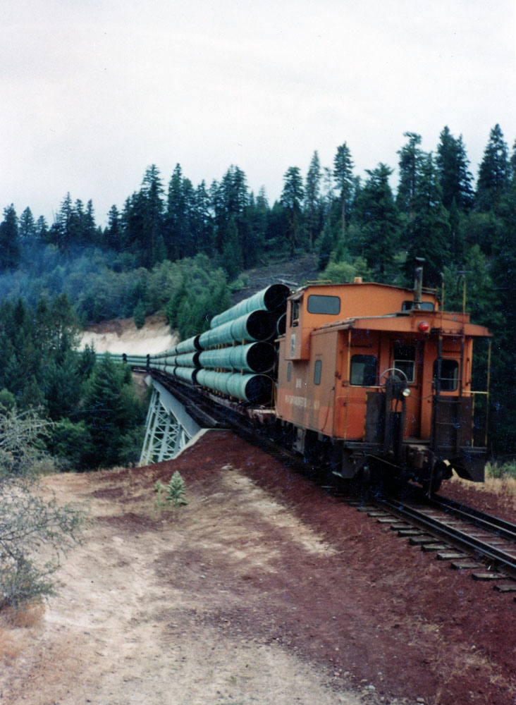 In 1960, Pacific Gas & Electric Company built a natural gas pipeline from Canada to the Bay Area of California. Burney was selected as construction base for the pipeline project, and the McCloud River Railroad moved over 1,000 carloads of pipe into Burney. The pipe arrived on flatcars at Mt. Shasta City, and the McCloud River ran one giant pipe train to Burney every night, using every available locomotive on the property. PG&E decided to add a second pipeline next to the first in 1992, and once again Burney was selected as a construction base. The railroad was once again called upon to haul pipe to Burney. The first train ran on a Friday night in late April of 1992, when two locomotives brought the first 15 cars to Burney before returning light to McCloud. Once again the pipe arrived in Mt. Shasta City, where it was interchanged to the McCloud River. The McCloud River ran one train a day to Burney to handle the pipe traffic. A typical day would see the crew go on duty in McCloud in the mid-morning. Their first act was to gather the empty pipe flats brought from Burney the day before. The crew would then take the flats “over the hill” to Mt. Shasta City, where the 15 empty pipe cars would be exchanged for 15 loaded pipe cars. The crew would then run through to Burney, where the loads would be exchanged for empties, which were returned to McCloud. The cycle would be repeated the next day. If Sierra Pacific needed to be switched, lumber cars would be added onto the pipe train, and the round trip would take two crews to complete. The McCloud Railway Company got to move one pipe train after they took over on 1 July 1992, and the job was done except for a handful of pipe cars that moved to Burney in the spring of 2002 for a small modification of the pipeline. |