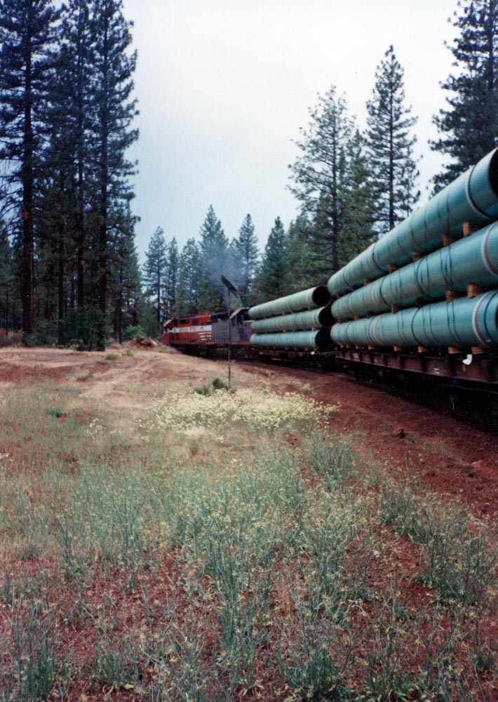 At Berry the pipe trains pulled onto the Sierra Branch so as to turn on the wye, then backed down to the unloading area in the old Burney yard. Jeff Moore |