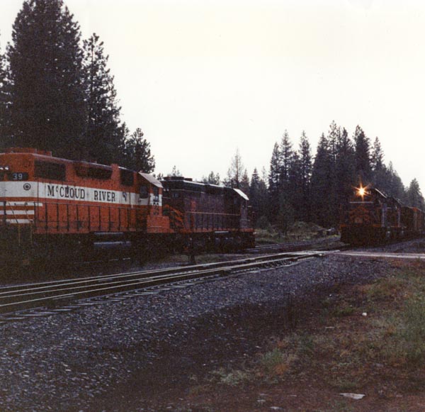 A rare shot of all four McCloud EMD's together. The #39 and #38 are working the interchange tracks at Lookout Junction to the left while the #36 and #37 power a southbound BN train to the right. The McCloud did not need all four locomotives on the property during much of the 1980's, and the company realized extra revenue by leasing the surplus power out. |