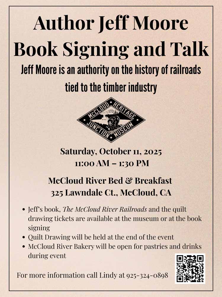 13 September 2025: Presentation, More Models, and Other Updates There have been several developments on various fronts through the past several months. McCloud Book Presentation First off, I have been in discussions over the last several years of doing some form of a book signing event with the McCloud Heritage Junction Museum, which bought copies of my McCloud River book when Signature Press closed down their operations. Things have finally come together, and the event will be held on Saturday, 11 October 2025, from 11:00 AM to 1:30 PM at the McCloud River Bed & Breakfast at 325 Lawndale Court in McCloud. ![]()