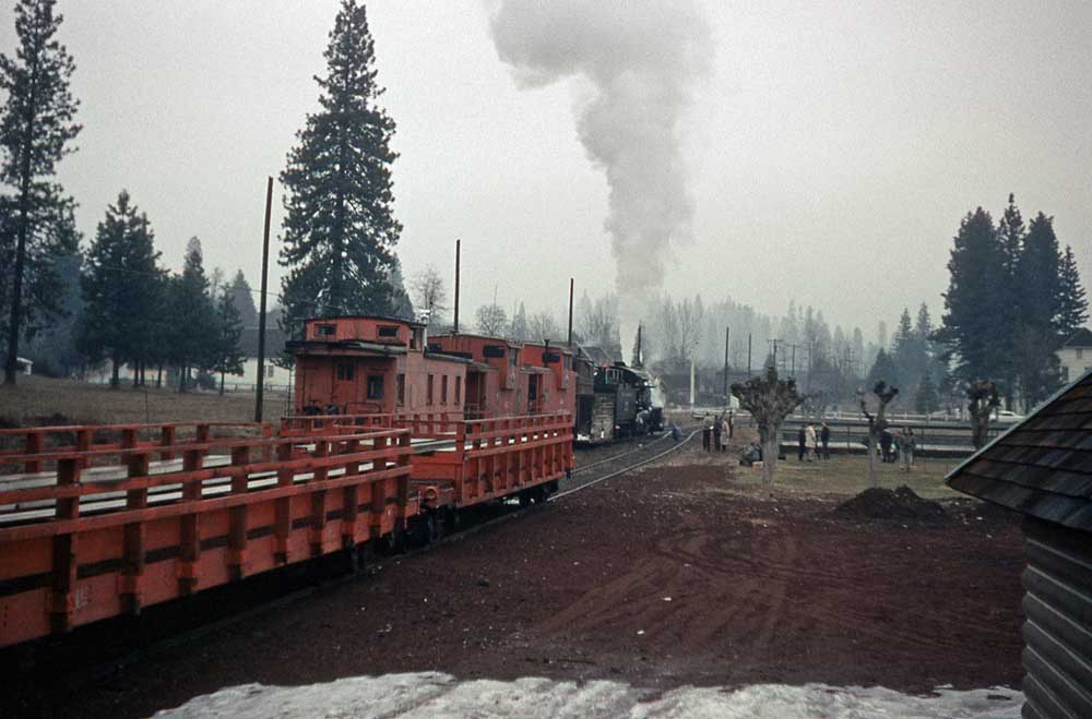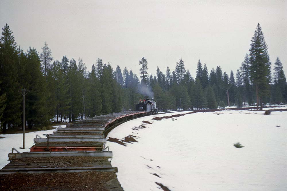 This 1965 trip included seven empty log flats for parts of the trip and three cabooses. The train is approaching the Pilgrim Creek Road crossing east of McCloud. C.G. Heimerdinger Jr. |