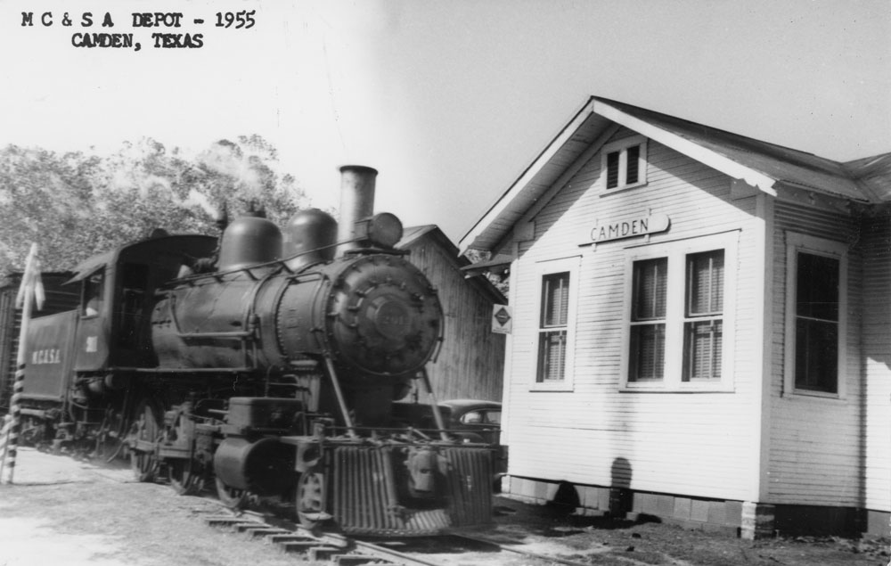 southwest of Barnum, to which his crews extended the narrow gauge tram. Construction of the new sawmill and the adjacent company town of Camden commenced as soon as ground could be cleared. The selected site lay as noted four miles south of the M-K-T's Trinity & Sabine Railway and six miles east of the north-south mainline of the Houston East & West Texas Railway, which had been started northeast from Houston in 1876, reached Lufkin in 1882, and completed a through line to Shreveport, Louisiana, in 1886. Carter opened negotiations with both carriers, and the HE&WT offered the better terms. On 23 June 1898 Carter and his associates incorporated the Moscow, Camden & San Augustine Railroad "to construct the proposed railroad from Moscow in Polk County, thence through Tyler and Angelina Counties to San Augustine in San Augustine County a distance of fifty miles. The corporate headquarters were established at Camden, Texas". Construction commenced quickly, with the 6.87 miles between Moscow and Camden, the only part of the projected line ever built, placed into operation on 19 November 1898. The decision to connect with the HE&WT proved somewhat prescient as the M-K-T entered receivership in 1915 and then sold the Trinity & Sabine Railway to the independent Waco, Beaumont, Trinity & Sabine Railway in 1923. The WBT&S itself declared bankruptcy in 1930 and abandoned the T&S in 1936. The MC&SA quickly settled down to its bucolic existence. The railroad commenced operations with a single 4-4-0 of unrecorded origin purchased for $1,950 when the road opened and apparently numbered #1. The railroad existed only to serve the needs of the W.T. Carter & Brother company, which largely meant hauling empty cars from the HE&WT interchange at Moscow to the Camden mills and then returning the cars to Moscow once loaded. Passengers and express traffic, which in the early years included almost all goods sold in the company store at Camden, rode in a caboose until the railroad purchased a combination passenger and baggage car in 1906. The Southern Pacific acquired control of the HE&WT in 1899, though the road would not be fully merged into SP's Texas & New Orleans subsidiary until the 1920s. W.T. Carter & Brother continued using the narrow gauge Shays to haul logs to the new mill until the company sold both in 1900. The Carter company apparently converted the tram roads to standard guage at this time and possibly acquired a standard gauge 2-6-0 or 4-4-0 of its own, or may have used the MC&SA #1 on the tram roads. Carter continued plowing every spare penny he could find into investing in every tract of trees in the area he could purchase. By 1905 the tram roads had started to extend far enough from Camden to require more locomotives, which prompted Carter to order three new 2-6-0 locomotives from Porter numbered 3, 4, and 5. The MC&SA annual reports filed with the State showed the railroad bought a second locomotive, listed in one report as the #7, in 1907. Little to nothing is known about the #7 other than it may have been either another 2-6-0 or a Shay. In 1910 W.T. Carter & Brother ordered a 46.5-ton 2-8-0 new from Baldwin that, when built in January 1911, left the factory lettered for the MC&SA. The #6 replaced the #7 upon arrival, but two years later the railroad sold the #6 back to the lumber company and spent a reported $5,285.13 rebuilding the #7 and placing it back in service. The railroad finally retired the #7, whatever it was, in 1915. W.T. Carter & Brother added a standard gauge Shay to its roster in 1912 that became the second locomotive to carry the #2. ![]()