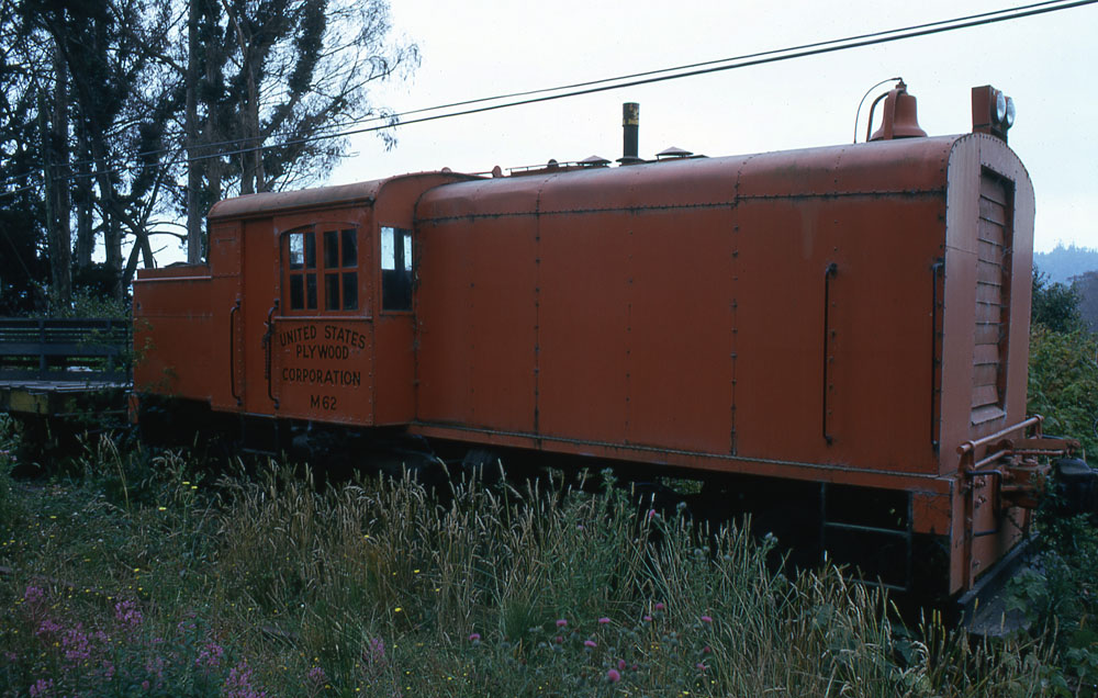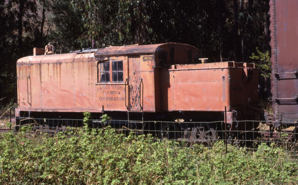 shell out of steel and plywood. The contraption entered service as Mutual Plywood #1954, perhaps for the year it was placed in service, later shortened to just #54. U.S. Plywood purchased Mutual Plywood in the early 1960s. The company repainted the two diesels, renumbering the #54 to M-62 in the process. U.S. Plywood elected to make the switching railroad an arm of the McCloud River Railroad shortly after purchasing that company. The arrangement did not last long enough for either of the locomotives to receive MR lettering, as USP shortly thereafter contracted the plant switching out to the connecting Northwestern Pacific Railroad. McCloud River continued maintaining the tracks in the plant, however, sending section crews to the coast as needed. At least one McCloud employee remembered the plant used peeler cores as ties. By 1965 U.S. Plywood decided to get out of the redwood region, and it sold the Fairhaven plant to Simpson Timber Company as part of a larger series of mutually benefitial transactions. Simpson operated the Fairhaven plant until 1981, which log shortages and market conditions forced its closure. Both of the switchers used in the operation are still in existence; the Davenport passed through private ownership before ending up in the Roots of Motive Power collection in Willits, California, while Frank Bayliss bought the M-62 for display at his Alton & Pacific tourist railroad in Alton, California. Northern Counties Logging Interpretive Association, now the Timber Heritage Association, purchased the M-62 from Frank after the A&P closed, and it has been in stored with the rest of the organization's collection since, currently at the old Hammond Lumber/Georgia Pacific shops in Samoa, not far from the site of the old Mutual plant. |